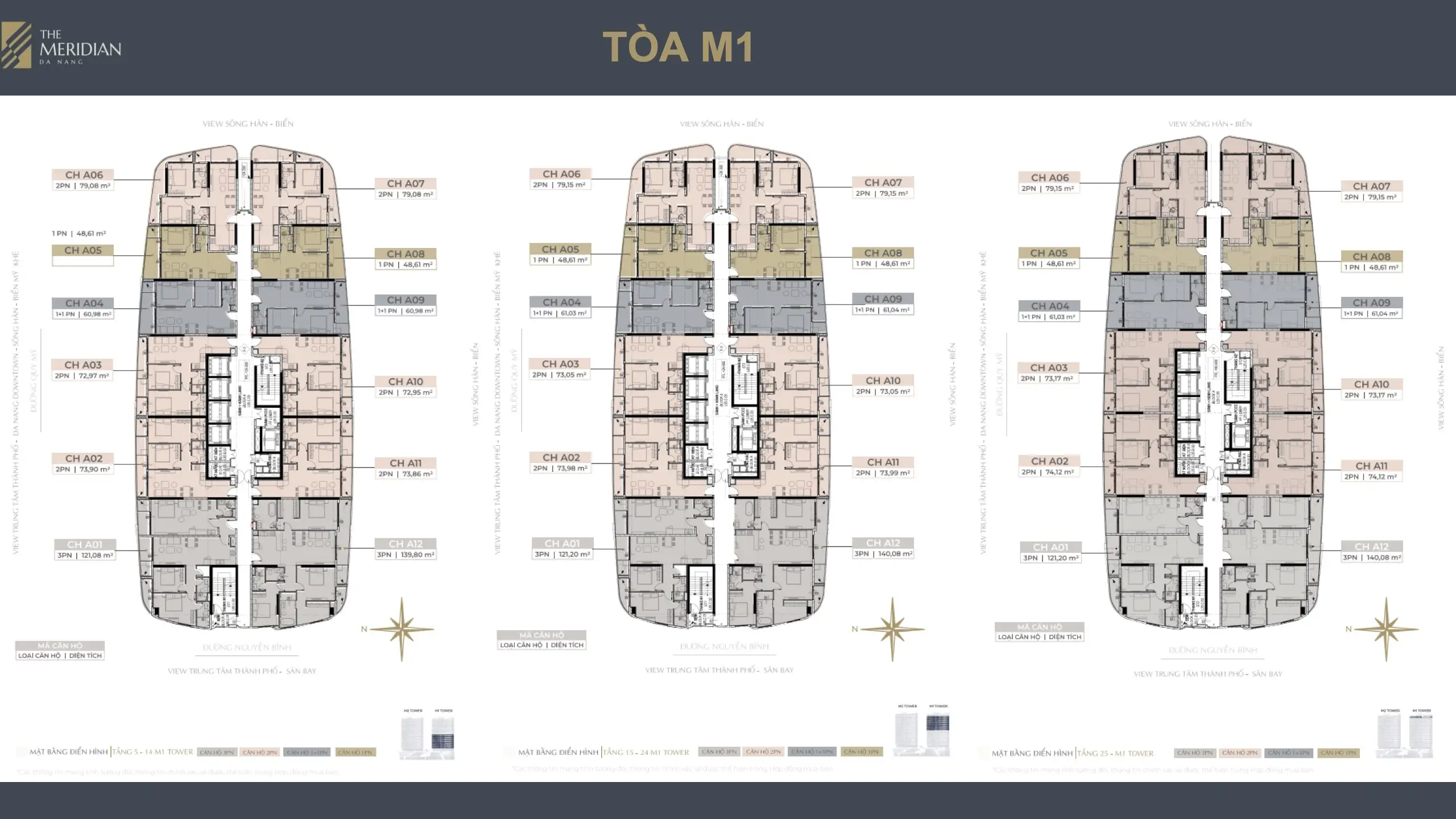 Căn hộ chung cư The Meridian Đà Nẵng được quy hoạch đa dạng: 1PN (53-59m²) cho cá nhân, 2PN (60-73m²) cho gia đình nhỏ, 3PN (99m²) cho gia đình đông đúc, lên đến 6PN (198m²) và penthouse. Thiết kế mở với bếp kết nối phòng khách, ban công rộng view sông. Mật độ thấp 10-12 căn/tầng đảm bảo riêng tư. Từ kinh nghiệm, chọn căn góc cho view 360 độ hoặc tầng trung (10-15) để tránh ồn ào. So với The Pavilion, mặt bằng đây linh hoạt hơn, dễ tùy chỉnh nội thất, phản ánh triết lý sống hiện đại.